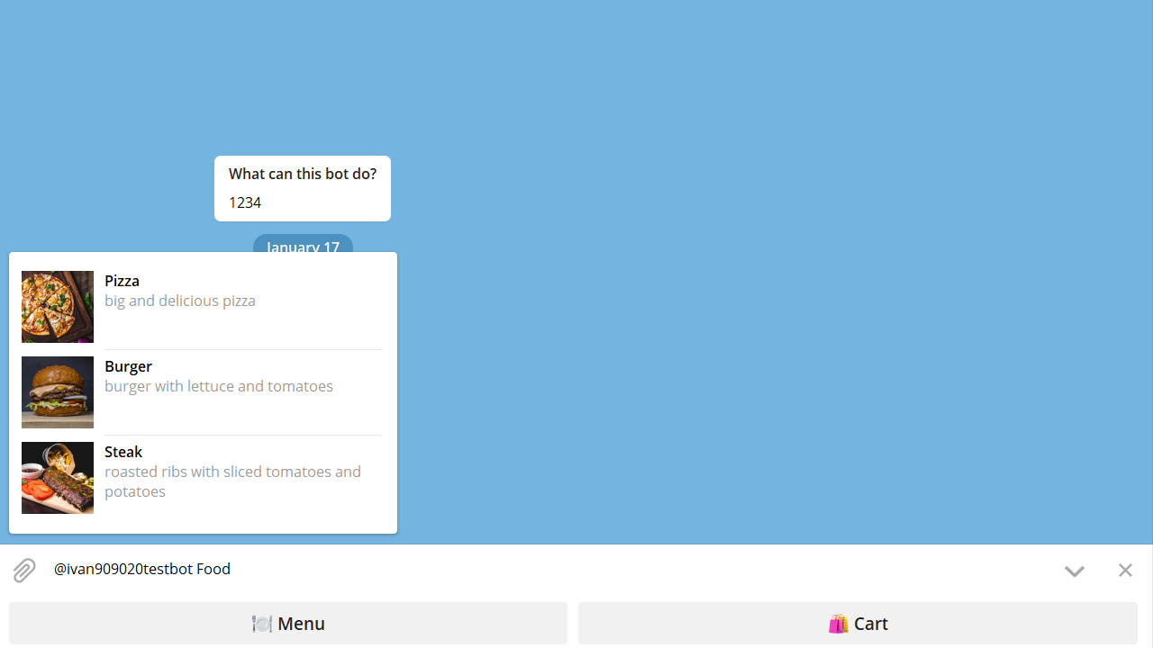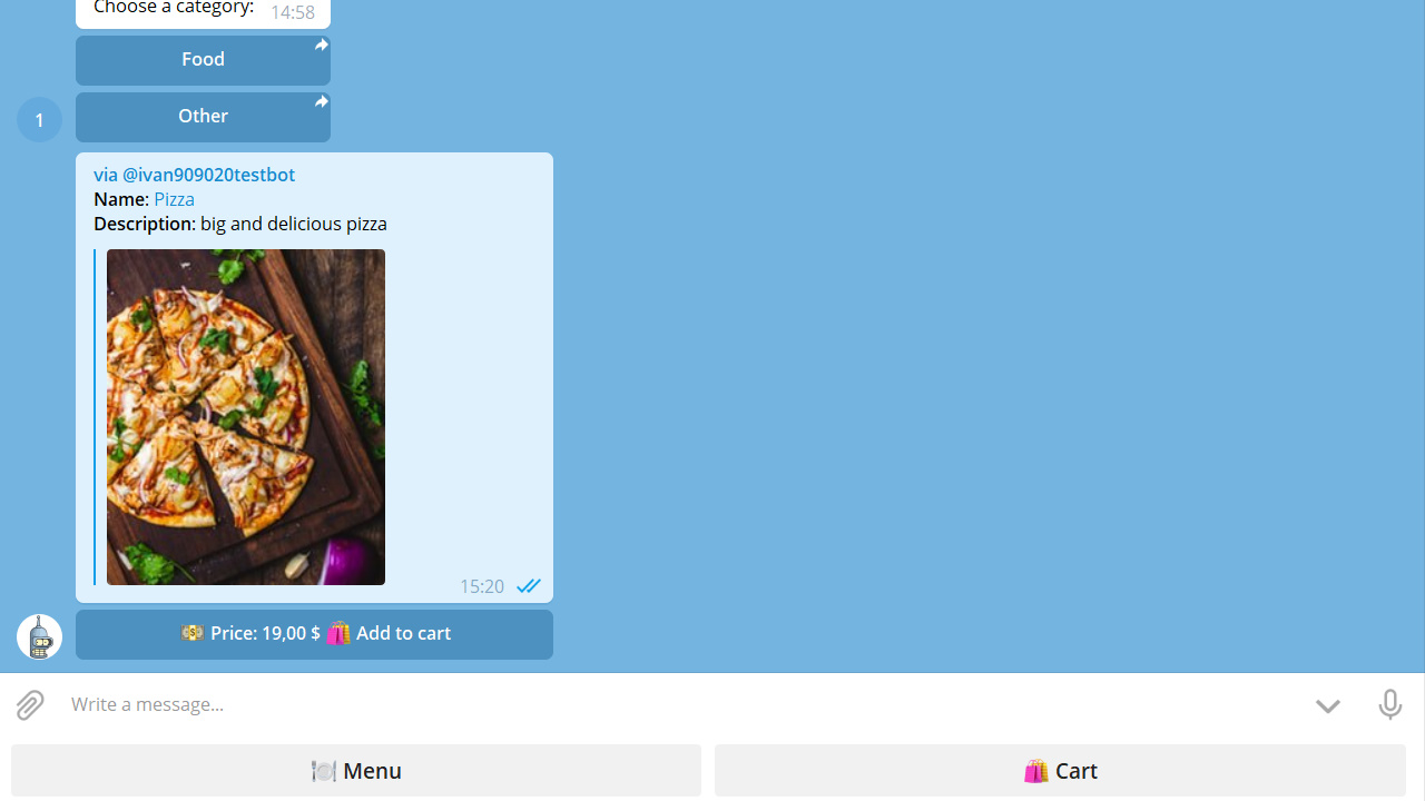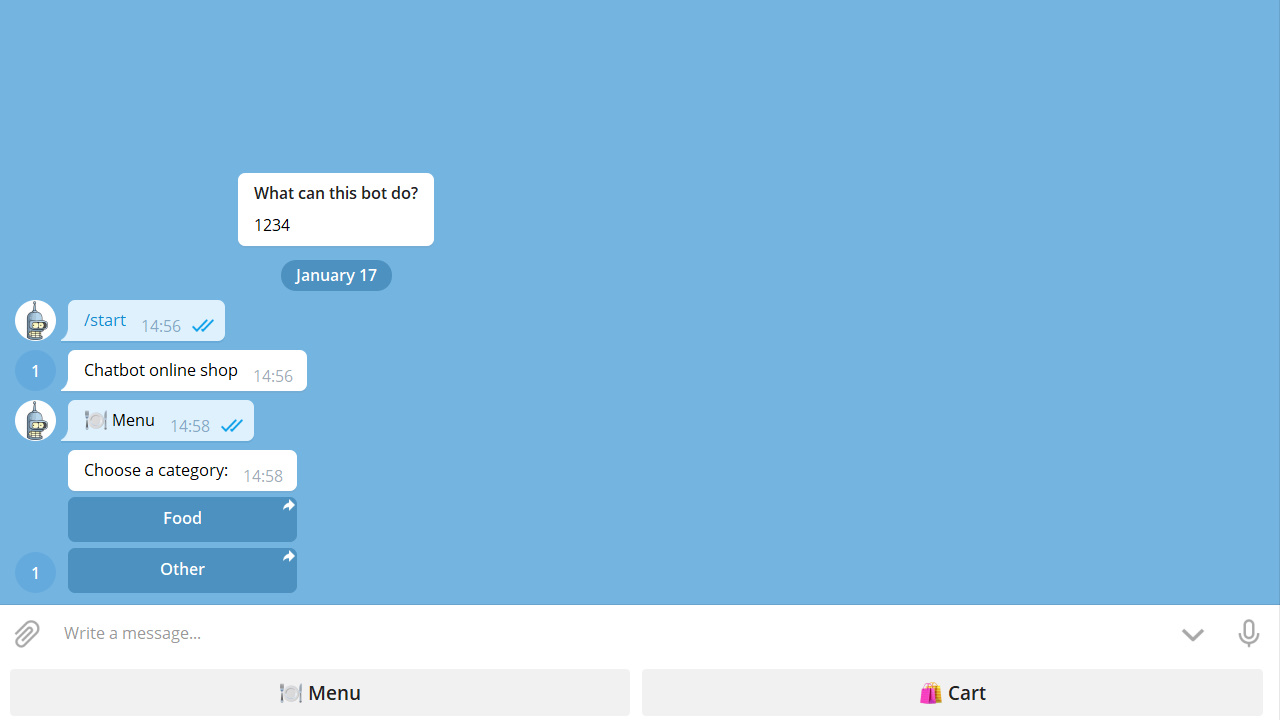 Replace `your-directory` with directory where the cloned repository is located `nano /etc/systemd/system/shop-telegram-bot.service` ``` [Unit] Description=shop-telegram-bot After=syslog.target [Service] WorkingDirectory=/your-directory/shop-telegram-bot/ ExecStart=/usr/bin/java -jar /your-directory/shop-telegram-bot/telegram-bot/target/telegram-bot-1.0.0-jar-with-dependencies.jar StandardOutput=journal StandardError=journal SyslogIdentifier=shop-telegram-bot SuccessExitStatus=143 Type=simple Restart=always [Install] WantedBy=multi-user.target reboot.target default.target poweroff.target ``` `systemctl daemon-reload` `systemctl enable shop-telegram-bot.service` `systemctl start shop-telegram-bot.service`Screenshots